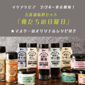 第一弾として、万能調味料セット「俺たちの日曜日」の販売が、応援販売サイトマクアケで、2/24の12時から始まります!